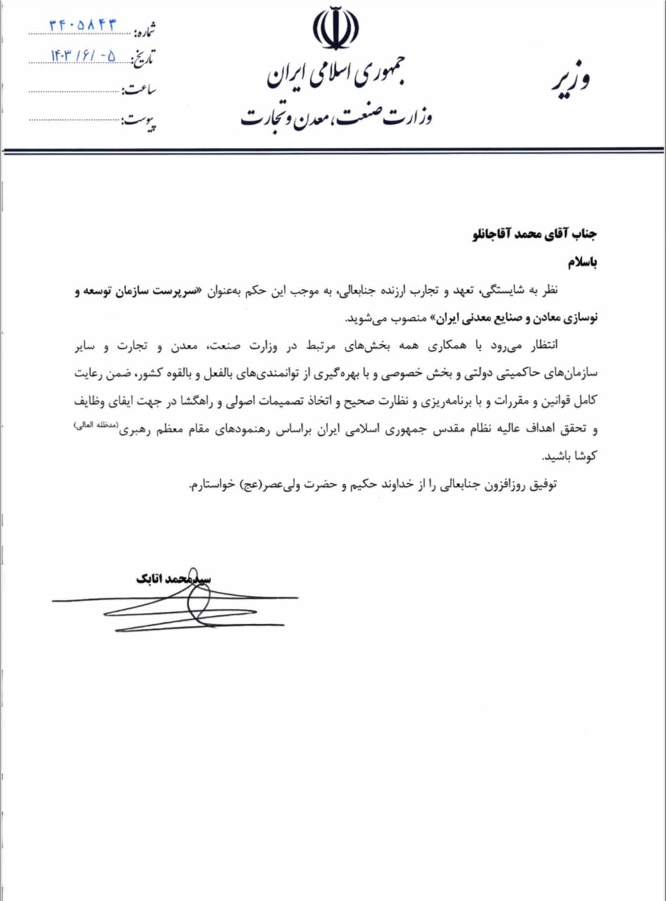 طی حکمی از سوی محمد اتابک، وزیر صمت، مهندس محمد آقاجانلو (متالورژی 78)، به عنوان سرپرست هیات عامل سازمان توسعه و نوسازی معادن و صنایع معدنی ایران معرفی شد.